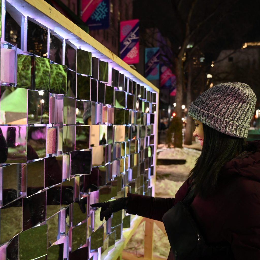 PIXEL-8 is an abstract art installation that can evolve depending on the participant. The installation is inspired by the act of play and vibrancy in an otherwise cold, inactive winter landscape. The 200 reflective pixels spanning 8 feet can be interacted with to provide a distorted reflection of the urban environment it is facing – or a distorted perspective of the user interacting with the installation. With lighting installed behind the reflective pixels, unexpected glowing rays of light become exposed, further adding to the unique dynamism of the pixelated board.