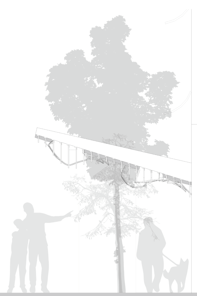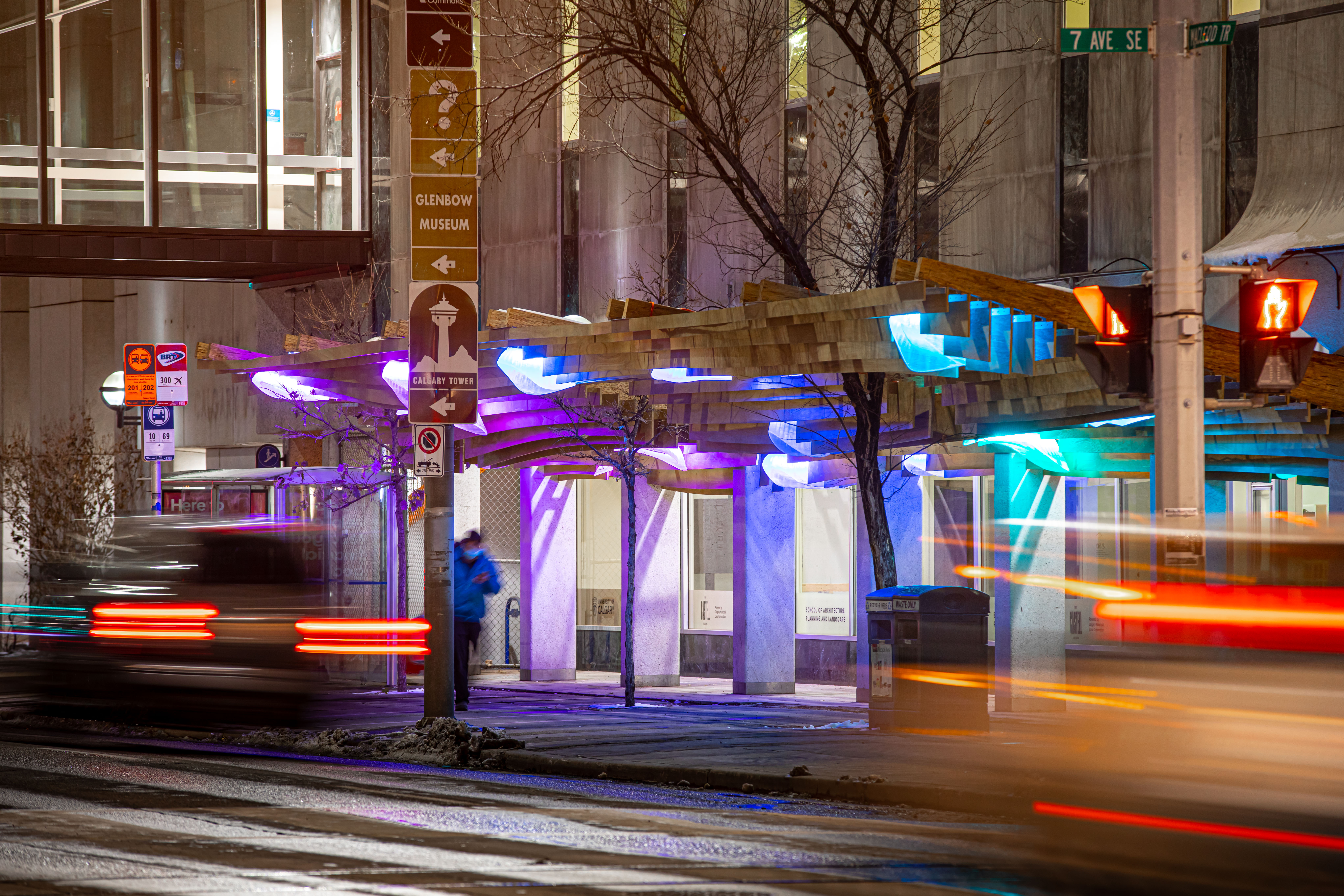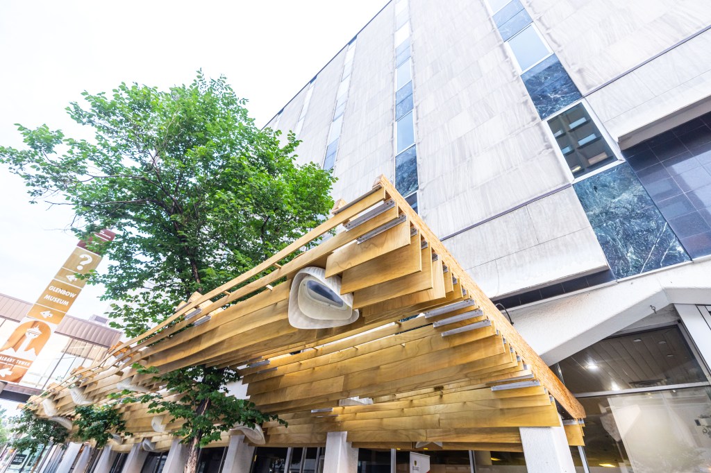 The canopy slats respect the existing trees by flowing around them and integrating the trunks into the design. We utilized weather-resistant parallel strand lumber for the beams, and marine plywood for the slats. The project’s grand opening celebration with Calgary’s Mayor Nenshi took place in November 2020.