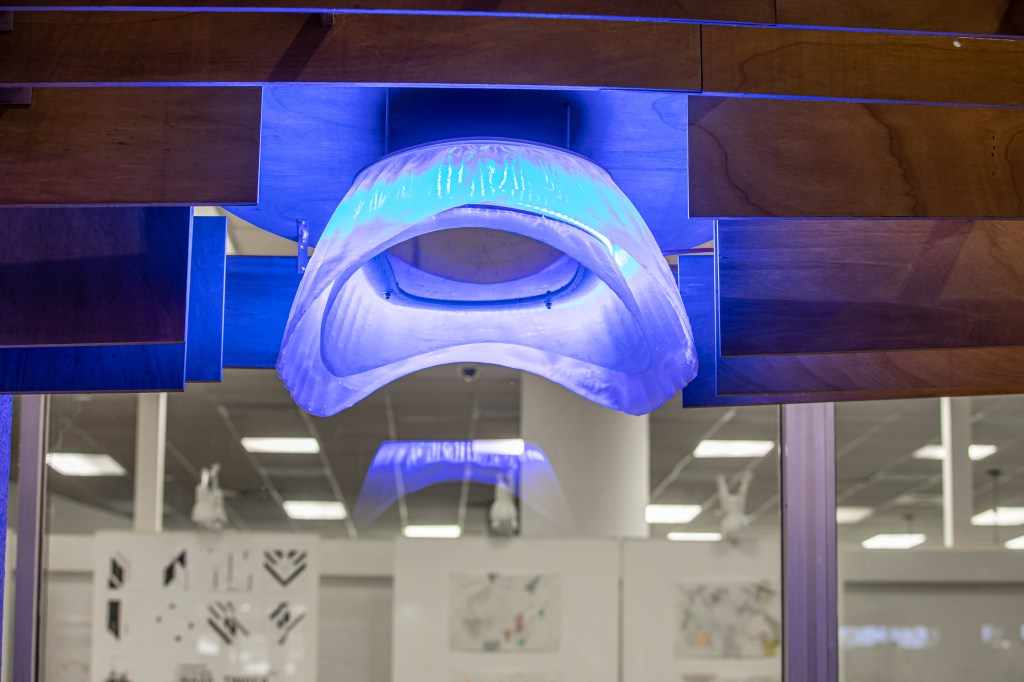 The canopy serves to provide a visual effect of undulations that change in appearance based on where you are standing or driving by. High and low points of undulations have lights inset that are motion-activated so in the evening, a pedestrian’s path will be lit. During the day, there is a one-way mirror in the lamp so you will see your reflection, giving the effect of eyes on the street and providing an overall feeling of safety.