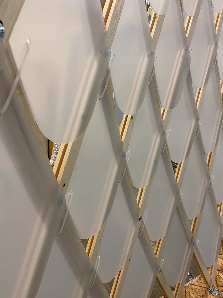 The Nook is an art installation designed to celebrate dynamism and activity in the dark times of winter and social distancing. The installation plays on the prevalence of plexiglass, and adds visual interest to the dark winter evenings with a motion-activated lighting system. The project utilizes a grid-shell structure designed in Grasshopper, and is weighted by a CNC-milled OSB base for stability. The skin is made of hundreds of thin plexiglass that is not only an ode to the pandemic, but also allows light to reflect off of it and to see people on either side of the installation. The entire installation is designed and assembled in parts that can be assembled and disassembled with ease. COVID-19 has had a significant impact on our lives; The Nook brings light and dynamism based on the movement of people at a safe distance.