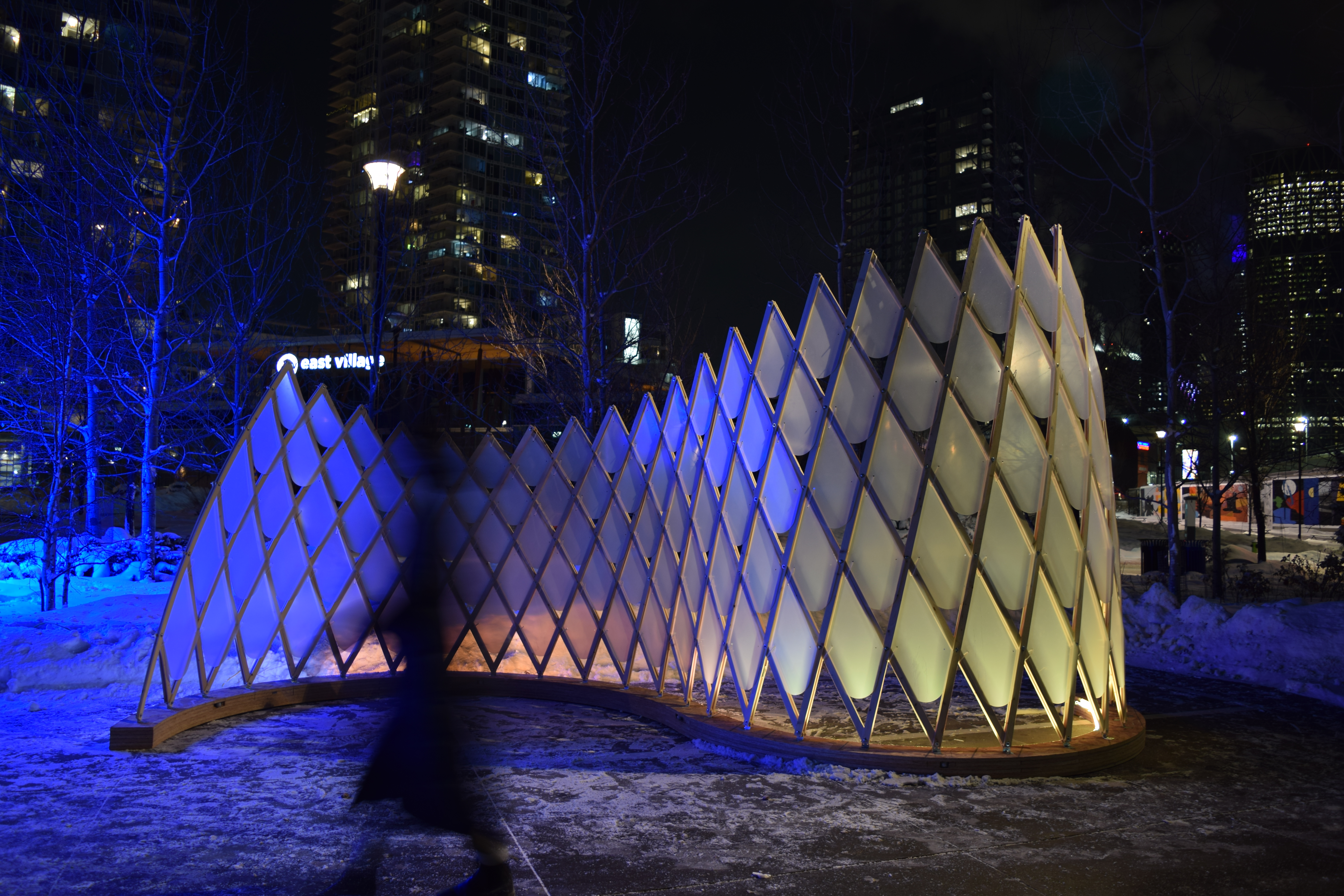 2020 was characterized by many as a very unusual year. In addition to the concern associated with a global pandemic sickening and killing masses of people, we experienced quarantine lifestyles of staying home and not travelling anywhere. Masks, plexiglass barriers, and social distancing were all key elements of 2020. When it comes to winter, this is compounded with the fact it is too cold outside to do safe outdoor activities. Working with my partner Madisen Killingsworth, we designed an outdoor pavilion that would provide a refuge from the cold while promoting visual interest and vibrancy.